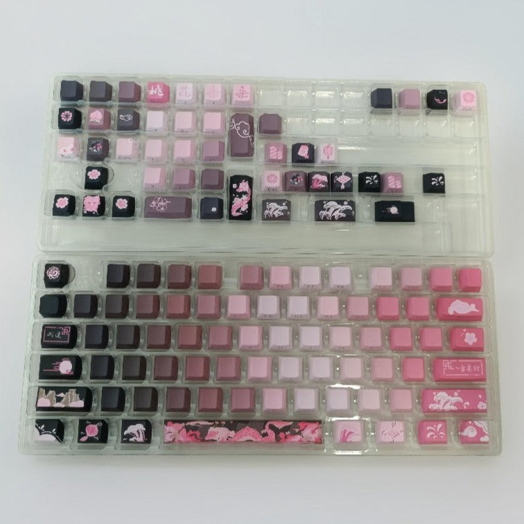 The TaoYaoLong keycaps set is comprised of pink-black gradient color Chinese-style keycaps. Each keycap is intricately adorned with emblematic symbols of Chinese culture: majestic dragons, graceful freehand landscape paintings, delicate peach blossoms, radiant lanterns, and ornate Chinese knots. Embracing the profound heritage of Chinese traditions. Not only does it boast a stunning appearance, but it also boasts superior quality. The keycaps are crafted from PBT material and subjected to dye sublimation processing, the keycaps exhibit enhanced durability and longevity.